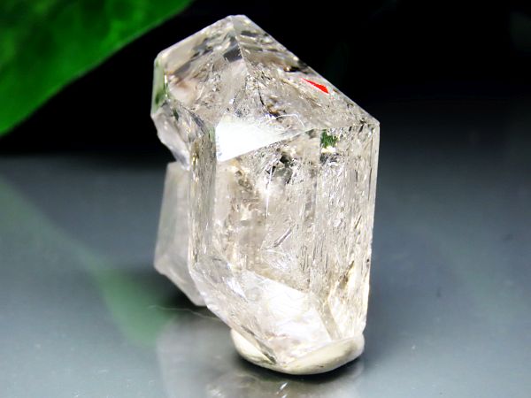 水入りエレスチャルクォーツ メキシコ産セプター型 (128) 寸法 約 W45.5x D22x H40(mm) 重量 約 40.8g 産地:Paradon, Coahuila, Mexico 寸法は 横幅Wx奥行Dx高さH で表示しています。 画像は約90度回転させて撮影した4枚に、上下から2枚、さらにポイントをとらえて撮影したものを掲載しております。エレスチャルは空洞が多いために照明に反射したり透明感が表現できない場合が多く、実物の方がほとんどの場合輝きや透明感があります。 画像からもお分かりいただけると思いますが、非常に透明度のある中に空洞が広がっています。透明度と照りのある亀の甲のような結晶に小さ目の両剣結晶がついた形で、水入り部分は小さな気泡が左右と上奥に動きますが、複雑な空洞部分に水が入っている為に気泡が引っ掛かって動きが見えない場合は、振ったり表面を軽くたたきながら動かしてみてください。 他の部分にも水が入っているような気配の輝きですが、気泡が見当たらないので確認ができません。 |