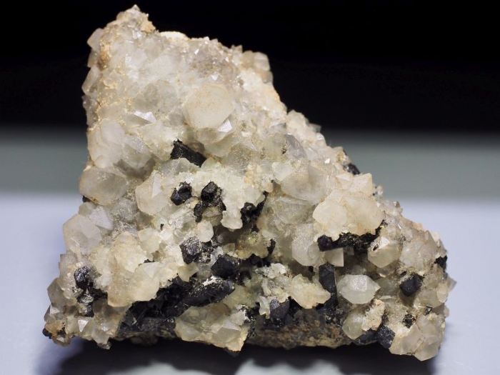 両剣水晶とイルバイト(珪灰鉄鉱) 極東ロシア/ダリネゴルスク産 (589) セール品 寸法 約 W102x D43x H79(mm) 重量 約 206g 産地:極東ロシア/プリモーリエ(沿海地方)/ダリネゴルスク産 ※寸法は 横幅Wx奥行Dx高さH で表示、画像は約90度回転させて撮ったものに表裏面、拡大画像などを加えています。 母岩の両面に、立面の短い両剣水晶の結晶に混ざった真っ黒な四角錐のような形をした柱状のイルバイトが共生している標本です。 イルバイトは3〜6ミリ幅の小さな柱状結晶ですが、片面は光沢のある結晶で、反面は艶消し状の結晶になっています。 ※台座等の付属品は特におことわりしない限り全てついておりません。 ※寸法は表題画像の 横幅Wx奥行Dx高さH で表示。 ※画像は時計回りに回転させて撮ったものに各部分や、その拡大画像などを加えて掲載しています。 |
