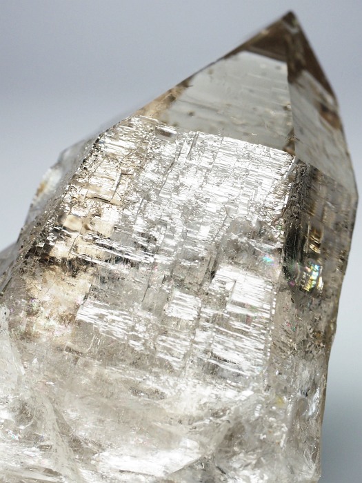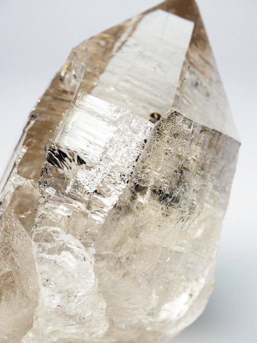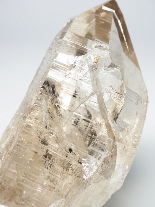 ビンタル式スモーキークォーツ スイスアルプス水晶単結晶 114mm 354g (36-13) 寸法 約 W58.3x D48x H114.2(mm) 重量 約 354g 産地:Binntal Valais Switzerland スイス,ヴァレー州,ビン渓谷 薄っすらスモーキー掛かった透明度の高い抜群の照りをもったビンタル式スモーキークォーツです。 最大の特徴は、条線(成長線)の彫りが強く、どの立面を見ても条線に覆われ、照明によって条線の輝く美しさを見られることです。 薄く色付き、透明度の高さ、マクロモザイクと呼ばれる条線の刻み、これらが重なって初めて見られる美しさです。 レインボーも見られ、さながらアルプスレムリアンと言った表現ができそうです。 深く刻まれたカテドラル部分が見る方向によって凹んで見え、下部の雷に打たれたと思える部分に斜めに剥離した(自然修復された表面)部分の為に、、形状のバランスが少々と思えるので、割引させていただきました。 この条線の美しく見える結晶、下部を切り落とすと更に安定した美しい結晶に見えますが、見る方向を変えれば十分です。 他の5つの立面の条線の画像もご覧ください。 【1】 【2】 【3】 【4】 【5】 ※台座等の付属品は特におことわりしない限り全てついておりません。 ※寸法は表題画像の 横幅Wx奥行Dx高さH で表示。 ※画像は時計回りに回転させて撮ったものに各部分や、その拡大画像などを加えて掲載しています。 |