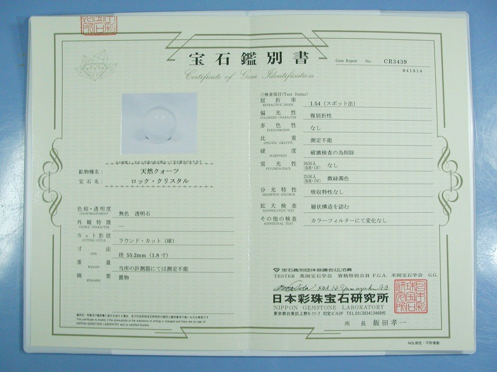 水晶玉・3A最高級天然水晶玉 鑑別書付(CR3439) 55.2mm 寸法 約 φ55.2(mm) 重量 約 232g ブラジル産の100%透明クリアー3Aクラスの天然水晶玉です。 現品の写真を撮っておりますので画像のものをお届けさせて頂きます。 日本彩珠宝石研究所の鑑別書が付いています。 鑑別書番号NO.CR3439→クリック【拡大】 検索サイトよりお越しのお客様は 水晶玉・3A最高級天然水晶玉 掲載ページに移動してご覧下さい。 |