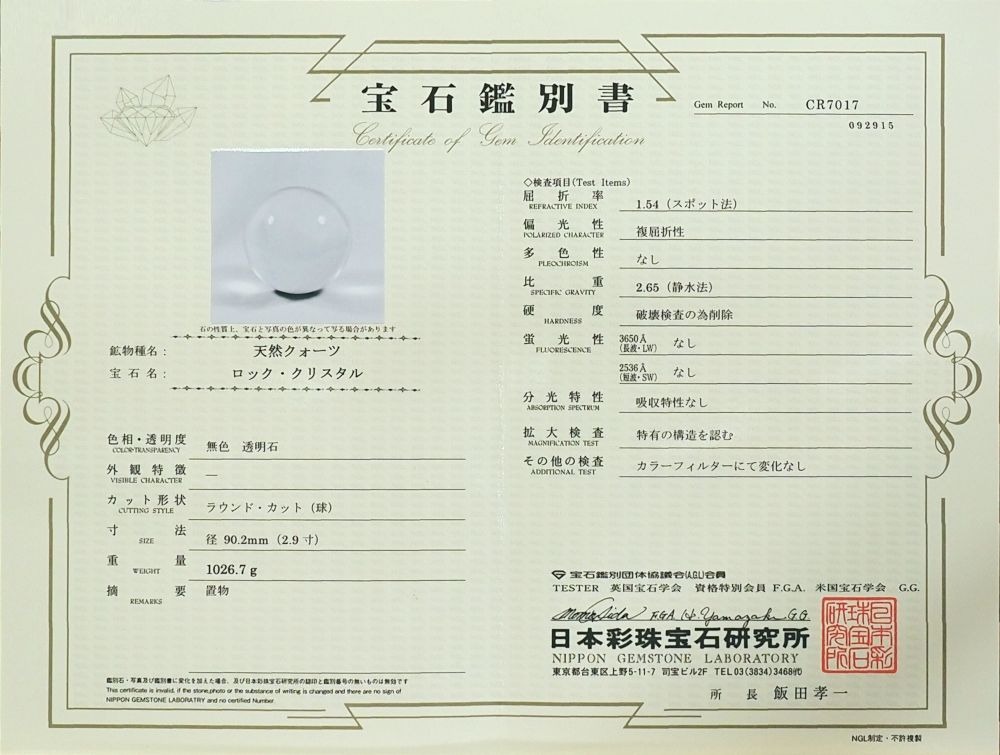 水晶玉・3A最高級天然水晶玉 鑑別書付(CR7017) 90.2mm 寸法 約 φ90.2(mm) 重量 約 1026.7g 鑑別書番号NO.CR7017→クリック【拡大】 ブラジル産の100%透明クリアー3Aクラスの天然水晶玉です。 現品の写真を撮っておりますので画像のものをお届けさせて頂きます。 日本彩珠宝石研究所の鑑別書が付いています。 |