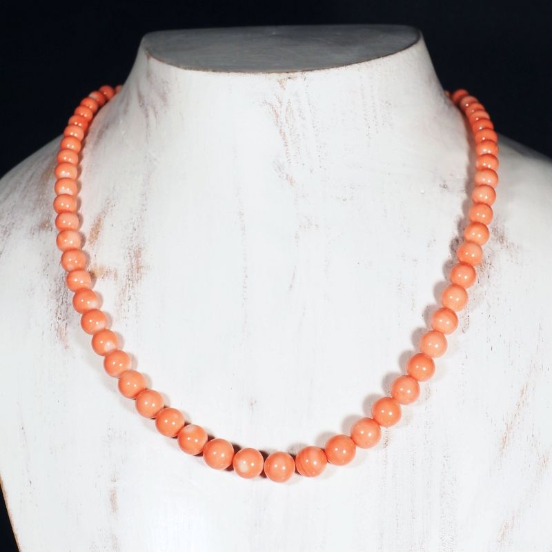 桃色珊瑚ネックレス 高知沖 (品番041) 寸法 全長L 約 42.5(cm) 天然石 約 φ3.4~7.9(mm) 玉数 67(個) 重量 約 24.3(g) 金具素材 K18 φは直径、W…幅、D…奥行(厚み)、LorH…長さ又は高さ を表示しています。 直径3.4oから7.9oのグラデーションサイズになっております。 珊瑚の見分けも難しく、近年では染色、養殖もの、地中海産など多くが紹介されておりますが、30年近く前にネックレス用ビーズとして甲府の職人によって加工された高知沖のものを仕入れ保管していたもので、今回ネックレスとして仕上げました。 |