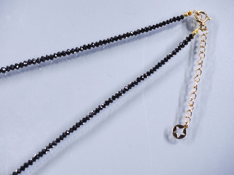 ブラックダイヤモンドネックレス (品番059) 寸法 全長L 約 41(cm) 天然石 約 φ2.5~2.9(mm) 重量 約 5.2(g) 金具素材 K18 φは直径、W…幅、D…奥行(厚み)、LorH…長さ又は高さ を表示しています。 スピネルに比べると煌めき方が全く違い強い輝きを見せています。ダイヤモンドだけで22.3ctあります。 金具はk18引き輪、アジャスター付きですので、41pより約+5pまで長くして使用できます。 |