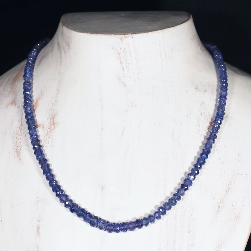 タンザナイトネックレス (品番065) 寸法 全長L 約 44(cm) 天然石 約 φ5.0~6.5(mm) 重量 約 21.4(g)(石のみ:105.1ct) 金具素材 K18 φは直径、W…幅、D…奥行(厚み)、LorH…長さ又は高さ を表示しています。 ボタンカット・グラデーションの一粒一粒に輝きがあり、105カラットもあるネックレスです。襟元で上品な輝きを放ちます。 ワイヤーの折り返し部分を長くして補強するために、石の両サイドには天然水晶ビーズを入れて製作しております。 |