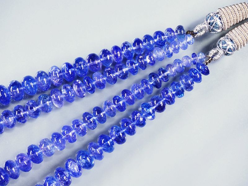 タンザナイトネックレス 2連 宝石質 (品番069) 寸法 全長L 約 44.1+48.5(cm) 天然石 約 φ3.8~12.5(mm)+φ5.6~10.5(mm) 重量 約 121.4(g)(石のみ:543ct) φは直径、W…幅、D…奥行(厚み)、LorH…長さ又は高さ を表示しています。 ジェイリークラスの丸ボタン・グラデーションの非常にゴージャスなタンザナイトネックレスです。 宝石質タンザナイト特有のピンク掛かった色合いの石が多く含まれております。 長さは小さなてまり型のストッパーを紐の上をスライドさせて変えます。 宝飾店扱いのクラスのもので、一般の天然石店で探し出すのは難しいと思います。宝飾店でも高級品を取扱いされているところに置いておられると思います。 カメラでは紫系の色合いが青くなることが多く、本品もブルーが強く出ており実物とは異なった色合いになっています。 最上段の色合いに少し紫掛かった色合いを入れた感じの色合いです。実物に近い色合いが撮影できた時には最下段(9枚目)に追加掲載いたします。 |