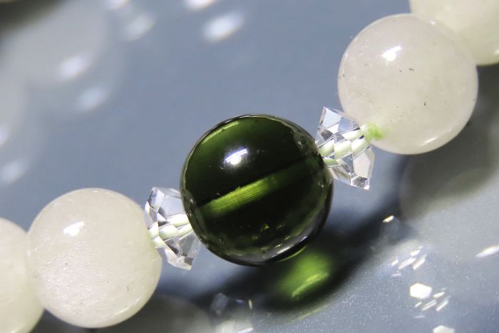リビアングラスブレスレット 10mm 内寸16.5cm (2) 玉径 約 10+11+10.5+4(mm) 玉数 16+1+1+2個 重量 約 25.5g 画像は時計方向に回転して撮影したものです。 リビアングラス10o16個にモルダバイト11o1個、ギベオン隕石10.5o1個を加え、更に4mm K18ミラーボール(メッキ品ではありません)で製作したブレスレットです。モルダバイト、ギベオンの両端にはカット水晶をいれ、K18ミラーボールを加えています。 モルダバイトは鑑別書番号NO.MM469→クリック【拡大1】のブレスレットをバラにした1粒を使用しております。 |