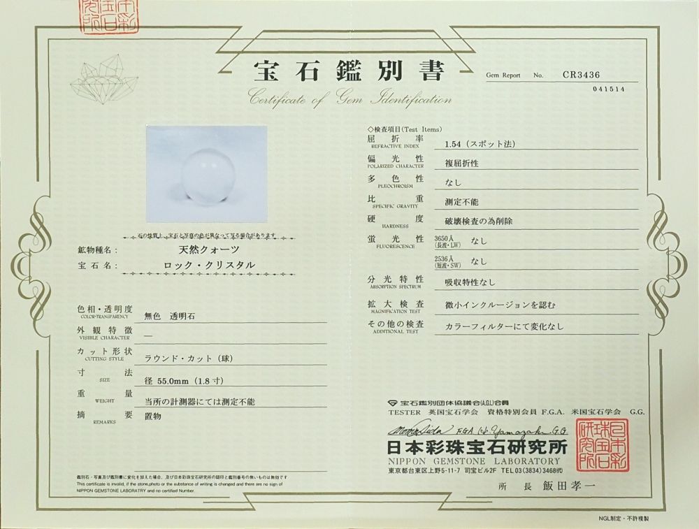 水晶玉・3A最高級天然水晶玉 鑑別書付(CR3436) 55.0mm 寸法 約 φ55.0(mm) 重量 約 230g 鑑別書番号NO.CR3436→クリック【拡大】 ブラジル産の100%透明クリアー3Aクラスの天然水晶玉です。 現品の写真を撮っておりますので画像のものをお届けさせて頂きます。 日本彩珠宝石研究所の鑑別書が付いています。 |