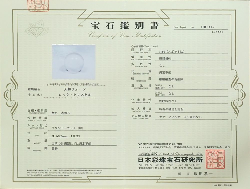 水晶玉・3A最高級天然水晶玉 鑑別書付(CR3447) 56.2mm 寸法 約 φ56.2(mm) 重量 約 246g 鑑別書番号NO.CR3447→クリック【拡大】 ブラジル産の100%透明クリアー3Aクラスの天然水晶玉です。 現品の写真を撮っておりますので画像のものをお届けさせて頂きます。 日本彩珠宝石研究所の鑑別書が付いています。 |