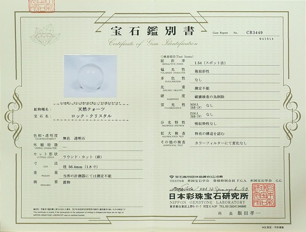 水晶玉・3A最高級天然水晶玉 鑑別書付(CR3449) 56.4mm 寸法 約 φ56.4(mm) 重量 約 248g 鑑別書番号NO.CR3449→クリック【拡大】 ブラジル産の100%透明クリアー3Aクラスの天然水晶玉です。 現品の写真を撮っておりますので画像のものをお届けさせて頂きます。 日本彩珠宝石研究所の鑑別書が付いています。 |