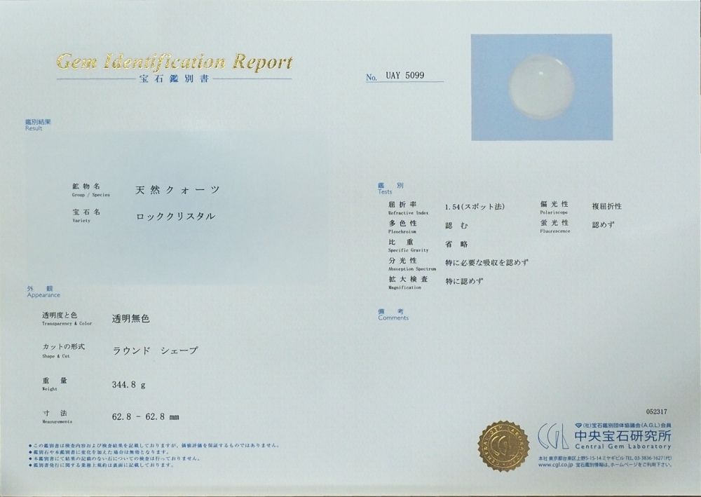 水晶玉・3A最高級天然水晶玉 鑑別書付(UAY5099) 62.8mm 寸法 約 φ62.8(mm) 重量 約 344.8g 鑑別書番号NO.UAY5099→クリック【拡大】 ブラジル産の100%透明クリアー3Aクラスの天然水晶玉です。 現品の写真を撮っておりますので画像のものをお届けさせて頂きます。 中央宝石研究所の鑑別書が付いています。 |