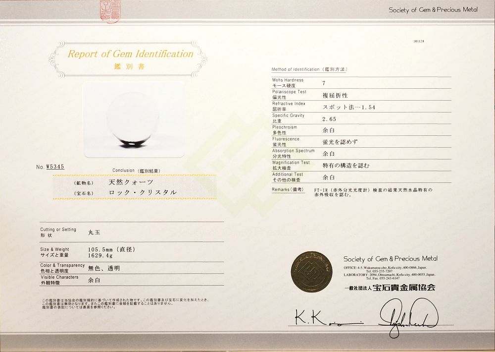 水晶玉・3A最高級天然水晶玉 鑑別書付(W5345) 105.5mm 寸法 約 φ105.5(mm) 重量 約 1629.4g 鑑別書番号NO.W5345→クリック【拡大】 ブラジル産の100%透明クリアー3Aクラスの天然水晶玉です。 現品の写真を撮っておりますので画像のものをお届けさせて頂きます。 一緒に写っているアメジスト丸玉は30ミリですので大きさを比べてみてください。 ※エアリースパイラル画像に付きまして 玉サイズが大きくなればなるほど拡散されて色合いが薄くなります。その為か、カメラのモニター画面で拡大して何とか確認できても、画像にはそのスパイラルの交差する部分が何度試みても表現できませんでした。従いまして、95ミリ以上の3A丸玉のスパイラル画像のご提供は難しそうです。 宝石加工の街・甲府にある社団法人宝石貴金属協会の鑑別書(ハードカバー収納)が付いています。 |