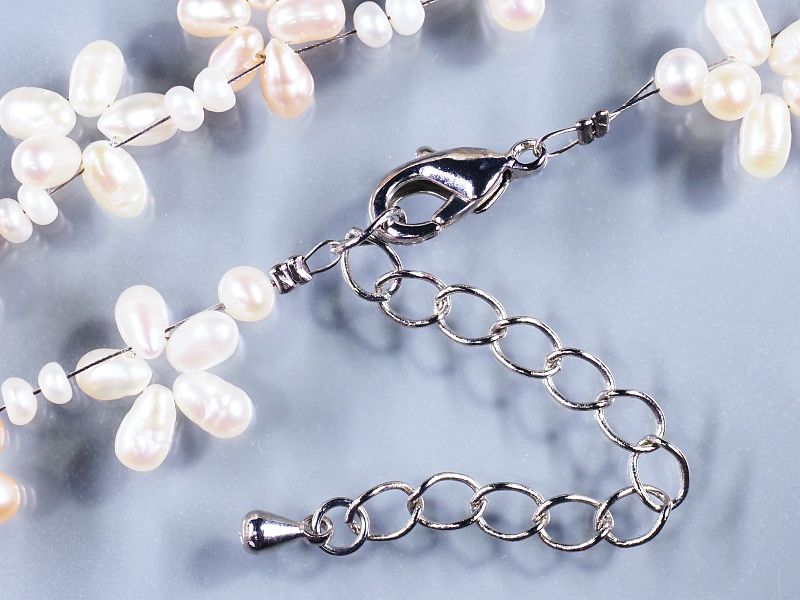 淡水パール フラワー (品番336) 寸法 全長L 約 41.5(cm) 重量 約 15.1(g) 金具素材 真鍮・メッキ φは直径、W…幅、D…奥行(厚み)、LorH…長さ又は高さ を表示しています。 ホワイトに少しピンク掛かった淡水パールを花柄に組み上げてネックレスにしております。可愛くお子様の発表会やお出かけ用などにも良いのではと思われます。 アジャスター付き留め金具ですので、+5センチくらい長くできます。 |