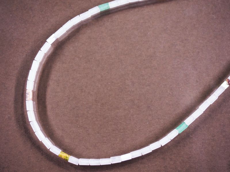 ホワイトクォーツ+ミックス石 ネックレス (品番346) 寸法 全長L 約 41(cm) 天然石 約 φ2xW4(mm) 重量 約 5.5(g) 金具素材 真鍮・メッキ φは直径、W…幅、D…奥行(厚み)、LorH…長さ又は高さ を表示しています。 ホワイトクォーツに他の石種を加えたチューブ(筒)型の天然石ネックレスですが、ペンダントトップの吊り金具に幅5ミリのチェーンが通されればチェーンとしてもご利用いただけます。 他の石種の入れ方が異なりますので、画像のものをお届けいたします。 アジャスター付き留め金具ですので、+5センチくらい長くして使用もできます。 |