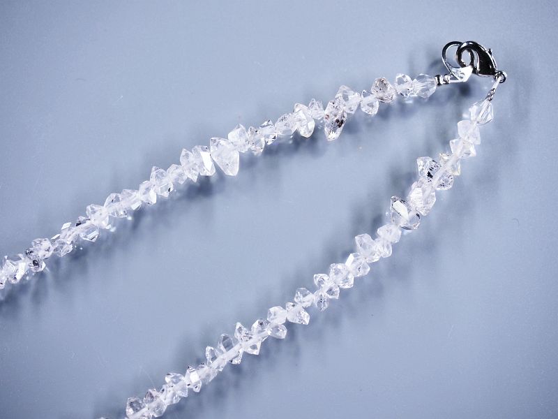 ハーキマーダイヤモンド ネックレス (品番353) 寸法 全長L 約 43.1(cm) 天然石 約 W4~8(mm) 重量 約 11.4(g) 金具素材 真鍮・メッキ φは直径、W…幅、D…奥行(厚み)、LorH…長さ又は高さ を表示しています。 透明感のあるキラキラ輝いているハーキマーダイヤモンドをネックレスに仕上げたものです。仕上げに目立たないように水晶菱形カットを両端に2個使用しています。 |