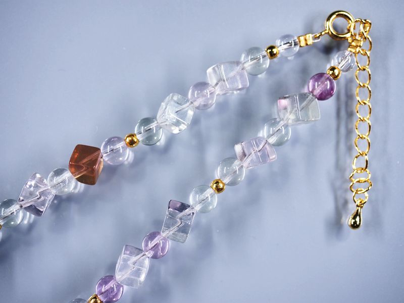 フローライトネックレス (品番360) 寸法 全長L 約 49(cm) 天然石 約 WDH6.5+φ6(mm) 玉数 26+39(個) 重量 約 35.7(g) 金具素材 真鍮・メッキ φは直径、W…幅、D…奥行(厚み)、LorH…長さ又は高さ を表示しています。 透明感のあるフローライト斜めキューブにφ6ミリのフローライト丸玉を間に入れ、更に金色ボールを入れて製作したオリジナルネックレスです。 両端仕上げに水晶丸玉5ミリを使用しております。 留め金具はアジャスター付きですので、+5センチくらい長くして使用できます。 |