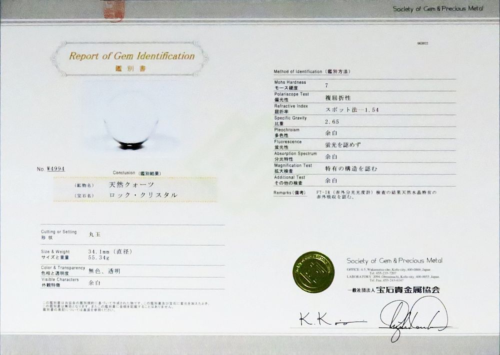 エアリースパイラル水晶 双晶 天然水晶玉3A 34.1mm 鑑別書付(W4994) 寸法 約 φ34.1(mm) 重量 約 55.34g ブラジル産の目視100%透明クリアーAAAクラスの天然水晶玉です。 富士山を背景にした水晶玉と、それぞれの水晶玉のエアリースパイラルの螺旋模様を加えた写真をお付けいたします。 透かし文字で店名を入れて掲載しておりますが、お届けいたします写真には透かし文字は入っておりません。 お届け致します写真には、双晶名と管理ナンバー(もしくは鑑別番号)のみを入れております。 水晶は「水の精」と呼ばれ、偉大な力、パワーを持った幸運を呼ぶ石、そして魔除けの力を持った聖なるものとして崇められ、万能のパワーストーンとして古来より珍重されてきましたてきました。 魔除け、邪気払いの力があるとされ、良い気を導くことより開運の石ともいわれ、さらなる向上を目指す時に持つと良いとされています。 他の石と組み合わせるとその石のパワーを強めてくれるとも言われております。 土地を清め、厄を払い運気を上げるために、その土地に埋められたりもします。 右巻き水晶(右水晶)は悪い気を放出、左巻き水晶(左水晶)は良い気を吸収する役目を持つと云われ、双晶は左右の役目を持ちさらに運気を上げると言われています。 宝石の街・甲府にある社団法人宝石貴金属協会の鑑別書(ハードカバー収納)が付いています。 鑑別書番号NO.W4994→クリック【拡大】 |