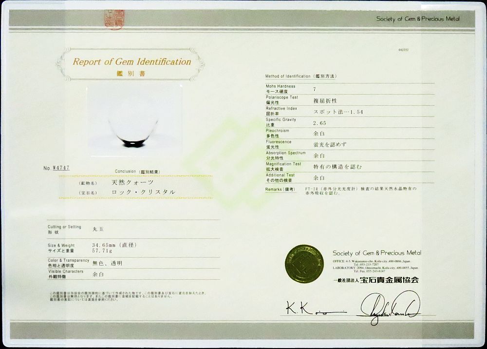 エアリースパイラル水晶 双晶 天然水晶玉3A 34.65mm 鑑別書付(W4747) 寸法 約 φ34.65(mm) 重量 約 57.71g ブラジル産の目視100%透明クリアーAAAクラスの天然水晶玉です。 富士山を背景にした水晶玉と、それぞれの水晶玉のエアリースパイラルの螺旋模様を加えた写真をお付けいたします。 透かし文字で店名を入れて掲載しておりますが、お届けいたします写真には透かし文字は入っておりません。 お届け致します写真には、双晶名と管理ナンバー(もしくは鑑別番号)のみを入れております。 水晶は「水の精」と呼ばれ、偉大な力、パワーを持った幸運を呼ぶ石、そして魔除けの力を持った聖なるものとして崇められ、万能のパワーストーンとして古来より珍重されてきましたてきました。 魔除け、邪気払いの力があるとされ、良い気を導くことより開運の石ともいわれ、さらなる向上を目指す時に持つと良いとされています。 他の石と組み合わせるとその石のパワーを強めてくれるとも言われております。 土地を清め、厄を払い運気を上げるために、その土地に埋められたりもします。 右巻き水晶(右水晶)は悪い気を放出、左巻き水晶(左水晶)は良い気を吸収する役目を持つと云われ、双晶は左右の役目を持ちさらに運気を上げると言われています。 宝石の街・甲府にある社団法人宝石貴金属協会の鑑別書(ハードカバー収納)が付いています。 鑑別書番号NO.W4747→クリック【拡大】 現品のスパイラル画像の写真付きになります。 |