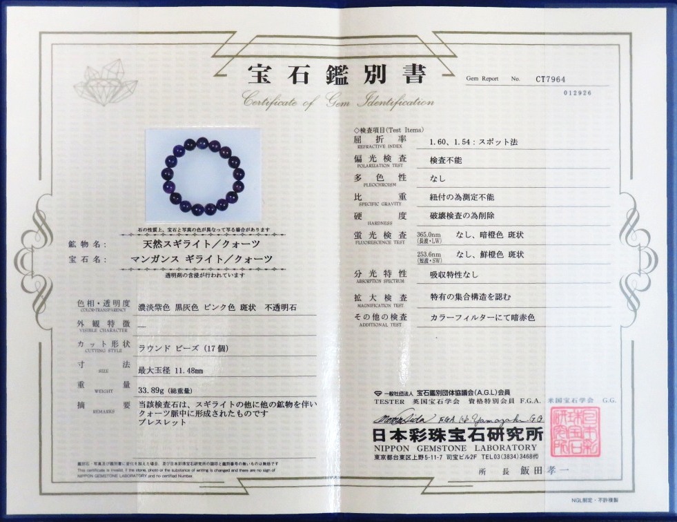 スギライトブレスレット 3A++ 11mm 内寸15.4cm (127) 鑑別書(CT7964)付 玉数 17個 重量 約 33.9g 玉径 約 10.8~11.5(mm) 鑑別書 鑑別書番号NO.CT7964→クリック【拡大1】 画像はすべて時計回りに回転して撮影したもので、約90度回転で4枚、 拡大で3+3+3+4+4(珠)で5枚、最下段は裏返した1枚となります。 一般的に3Aクラス以上で販売されているものです。(最上級はTOPで、その下は3A++表示となります。) TOPグレードでも通用する明るめですが、鮮やかさのある紫色のスギライトのみを集めて製作したものです。 研磨に苦労したようで、多面カット的な小さな平面的な部分の見られるビーズが含まれます。 画像での色合いは青寄りの紫色になっていますが、現品は赤よりの紫色になります。 ※選別はしておりますが、稀に小さく円形の平面的な表面を持つものが混ざっている 場合があります。 ※何度か撮影し実物に近い色合いを出すように心がけておりますが、ご覧いただいて いる環境によって色合い、照りなども異なって見える場合が生じます。 暗い画面では実物より濃く、明るい画面では実物より薄い色に見える傾向です。 ※ご不明点は、ご購入前に必ずお問い合わせください。 ※内寸を短くすることは可能で、余り玉もお付け致します。作業料は無料です。 |