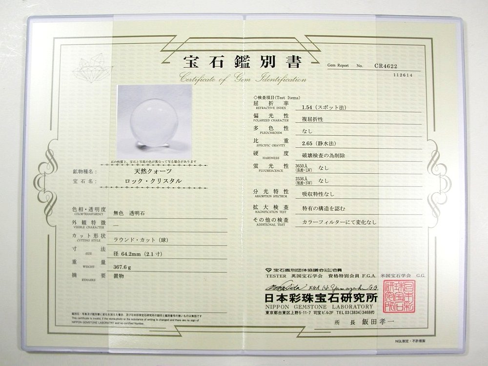 天然無垢3A 透明本水晶丸玉 鑑別書付(CR4622) 64.2mmM55付 寸法 約 φ64.2(mm) 重量 約 367.6g ブラジル産の100%透明クリアーAAAクラスの天然水晶玉です。台座M55をお付け致します。 現品の写真を撮っておりますので画像のものをお届けさせて頂きます。 日本彩珠宝石研究所の鑑別書が付いています。鑑別書番号NO.CR4622→クリック【拡大】 |