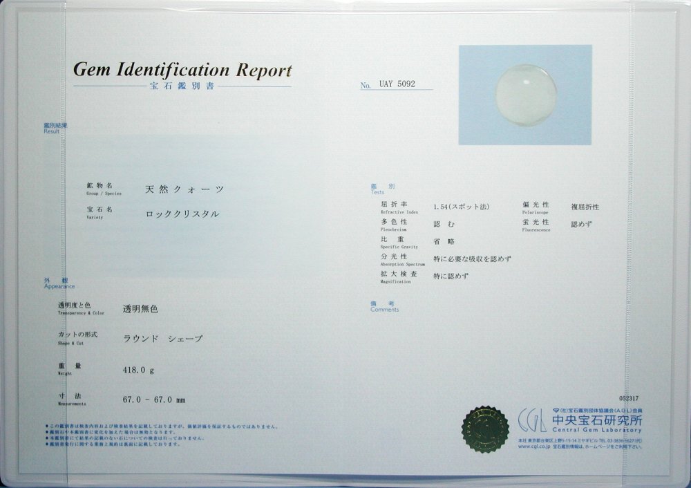 水晶玉・3A最高級天然水晶玉 鑑別書付(UAY5092) 67mmL65付 送料無料 寸法 約 φ67.0(mm) 重量 約 418g ブラジル産の100%透明クリアー3Aクラスの天然水晶玉です。台座L65をお付け致します。 現品の写真を撮っておりますので画像のものをお届けさせて頂きます。 中央宝石研究所の鑑別書が付いています。鑑別書番号NO.UAY5092→クリック【拡大】 |