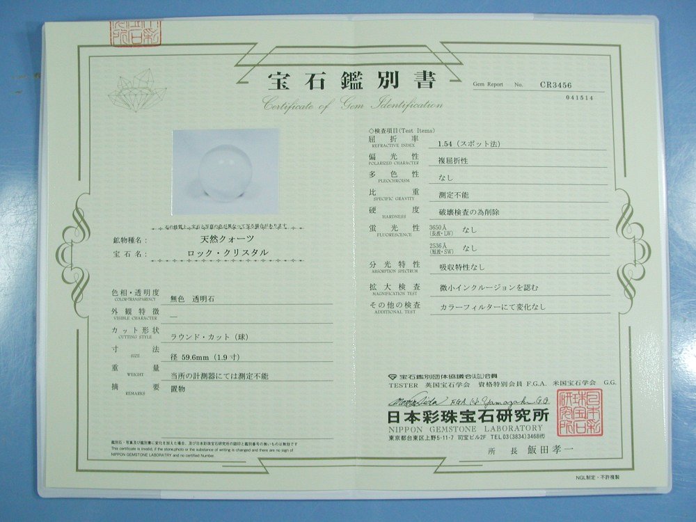 天然無垢3A 透明本水晶丸玉 鑑別書付(CR3456) 59.6mmM55付 寸法 約 φ59.6(mm) 重量 約 292g ブラジル産の100%透明クリアーAAAクラスの天然水晶玉です。台座M55をお付け致します。 現品の写真を撮っておりますので画像のものをお届けさせて頂きます。 日本彩珠宝石研究所の鑑別書が付いています。鑑別書番号NO.CR3456→クリック【拡大】 |